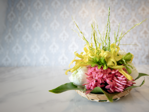 Người phụ nữ xinh đẹp ngồi chèo thuyền trong vườn hoa Cúc.