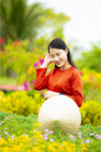 Người phụ nữ trẻ mặc áo bà ba đi dạo vườn hoa nhân ngày Tết truyền thống Việt Nam