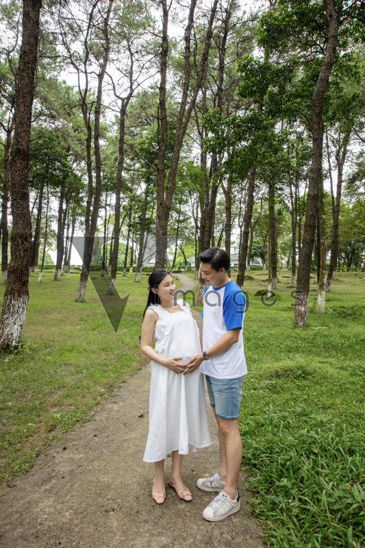 Phụ nữ châu Á đang mang thai hít thở không khí trong lành ở công viên cùng chồng